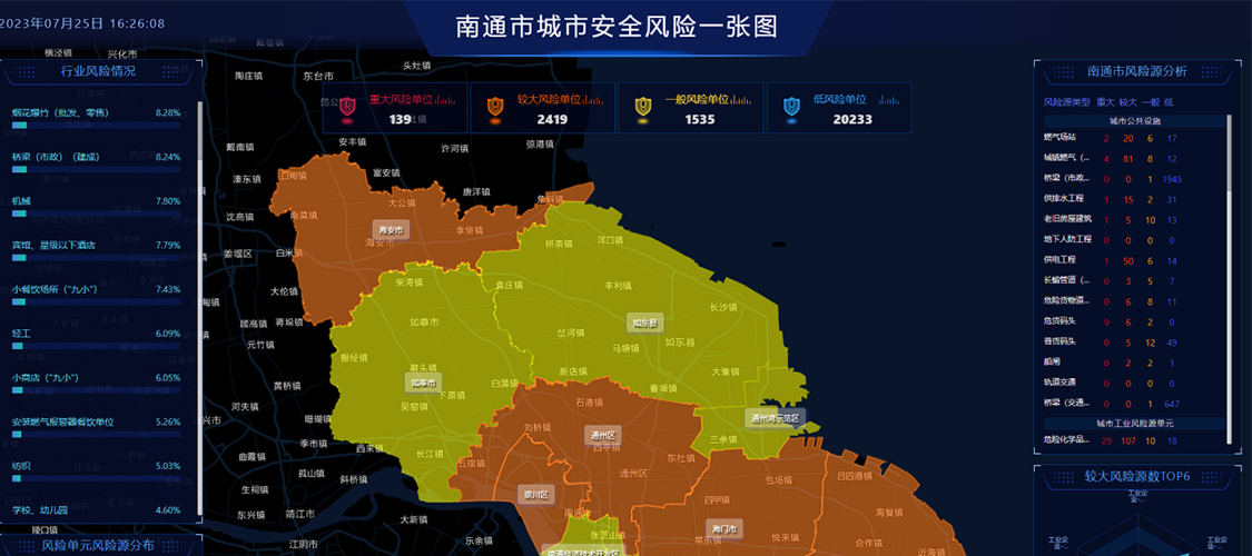 針對南通市3區(qū)、1縣和3縣級市全域開展風險辨識和評估,包括材料收集、走訪調查、建設城市風險平臺、線上填報、風險評估和現(xiàn)場復核等。